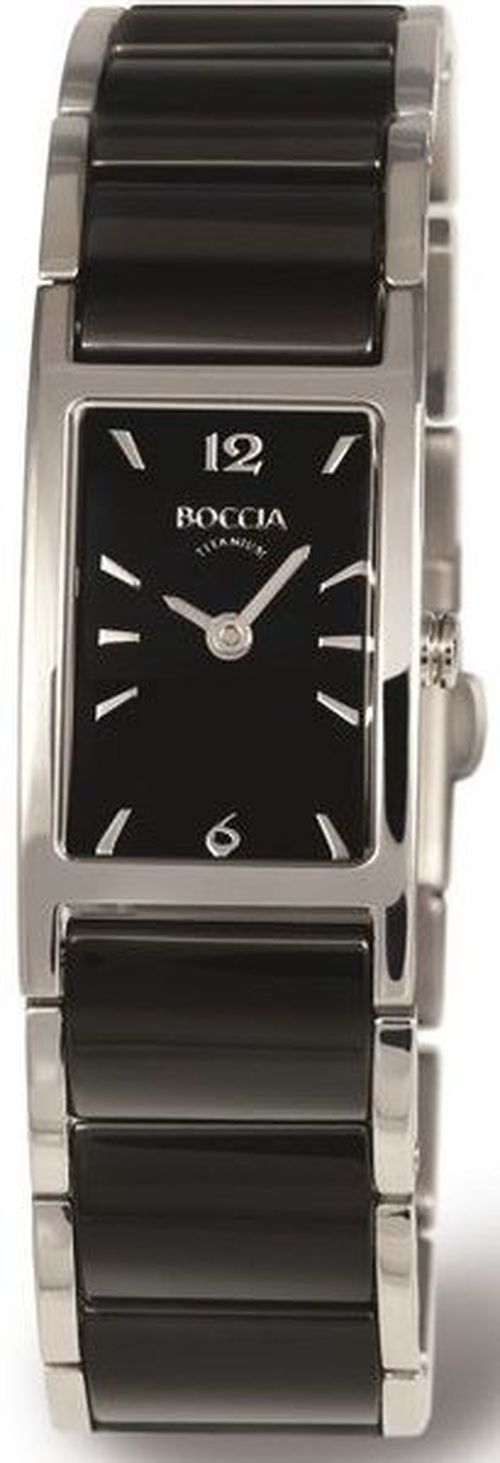 Dámské hodinky Boccia Titanium 3201-02 s pouzdrem obdelníkového tvaru. Střed titanového tahu je vyplněn černými keramickými díly, které ladí s černým ciferníkem. Dámské hodinky Boccia Titanium 3201-02 s pouzdrem obdelníkového tvaru. Střed titanového tahu je vyplněn černými keramickými díly, které ladí s černým ciferníkem.