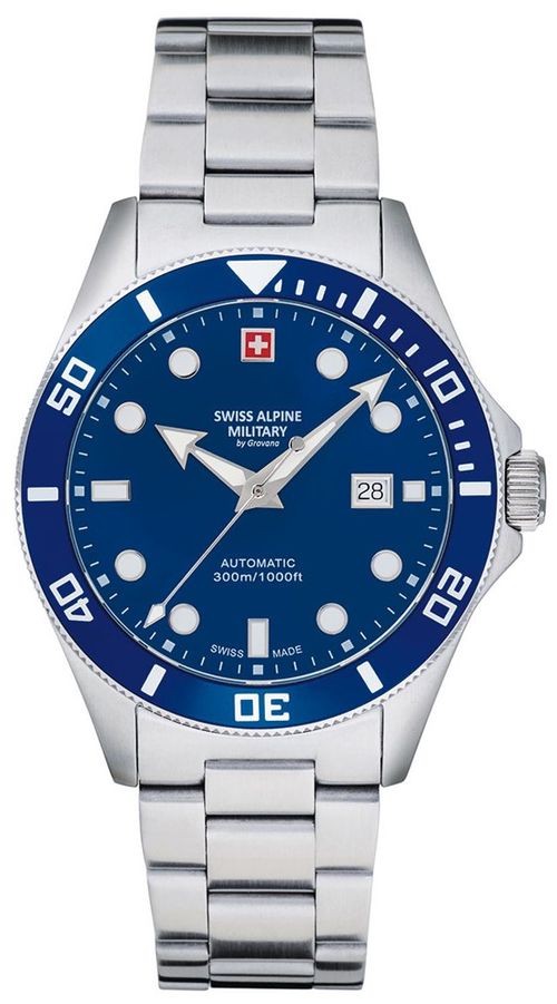 Značka: SWISS ALPINE MILITARY | Kolekce: AUTOMATIC | Model: 7095.2135 | Záruka: 3 roky | Barva: modrá | Barva: stříbrná | Barva pouzdra: stříbrná | Materiál pouzdra: ocel | Napájení: automaticky natahované | Materiál řemínku: ocel | Funkce: Datum - den v měsíci | Vodotěsnost: 300M/30ATM | Sklo: safírové | Tvar: kulaté | Typ zapínání: překlápěcí přezka s pojistkou | Číslice na ciferníku: indexy | Určení: pánské | Minimální obvod: 17 | Typ produktu: hodinky | Typ: ručičkové | Maximální obvod: 23 | Šířka řemínku: 22-20 | Průměr: 44 | Tloušťka: 12 | Strojek: SELLITA SW200-1
