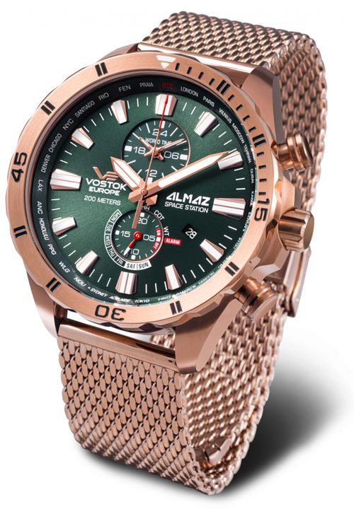 Značka: VOSTOK-EUROPE | Kolekce: ALMAZ | Model: YM8J/320B656B | Záruka: 2 roky | Barva: růžová zlatá | Barva: zelená | Barva pouzdra: růžová zlatá | Materiál pouzdra: ocel | Napájení: baterie | Materiál řemínku: ocel | Funkce: timer | Funkce: Datum - den v měsíci | Funkce: datum - den v týdnu | Funkce: denní alarm | Funkce: stopky | Funkce: Super-LumiNova | Funkce: světový čas | Vodotěsnost: 200M/20ATM | Sklo: minerální | Tvar: kulaté | Typ zapínání: meshové zapínání | Číslice na ciferníku: indexy | Určení: pánské | Minimální obvod: 16,5 | Typ produktu: hodinky | Typ: ručičkové | Maximální obvod: 22 | Šířka řemínku: 22 | Průměr: 47 | Tloušťka: 15,4