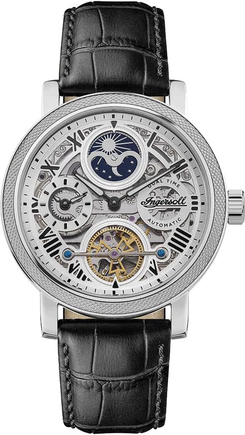 Značka: INGERSOLL | Kolekce: THE ROW | Model: I12401 | Záruka: 2 roky | Barva: černá | Barva pouzdra: stříbrná | Materiál pouzdra: ocel | Napájení: automaticky natahované | Materiál řemínku: kůže | Funkce: Duální čas | Vodotěsnost: 50M/5ATM | Sklo: minerální | Tvar: kulaté | Typ zapínání: standardní zapínání | Číslice na ciferníku: římské | Určení: pánské | Typ produktu: hodinky | Typ: ručičkové | Průměr: 44,6 | Tloušťka: 13,5