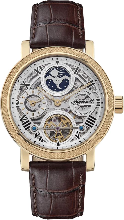 Značka: INGERSOLL | Kolekce: THE ROW | Model: I12402 | Záruka: 2 roky | Barva: hnědá | Barva pouzdra: zlatá | Materiál pouzdra: ocel | Napájení: automaticky natahované | Materiál řemínku: kůže | Funkce: Duální čas | Vodotěsnost: 50M/5ATM | Sklo: minerální | Tvar: kulaté | Typ zapínání: standardní zapínání | Číslice na ciferníku: římské | Určení: pánské | Typ produktu: hodinky | Typ: ručičkové | Šířka řemínku: 22 | Průměr: 45 | Tloušťka: 14,2