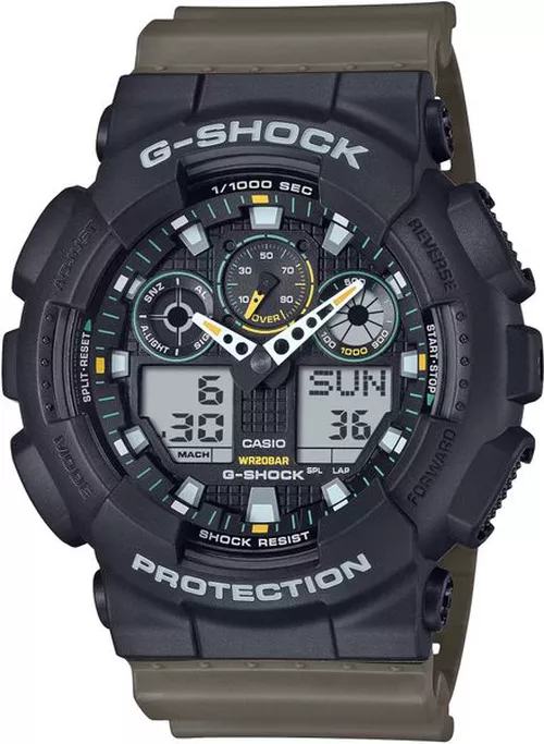 Casio G-Shock GA-100TU-1A3ER jsou pánské sportovní hodinky, nabízející množství funkcí ve spojení s bytelným zpracováním a prověřeným designem - ne náhodou patří model dlouhodobě mezi nejprodávanější. Casio G-Shock GA 100TU-1A3 doplňují řady modelů užívajících tlumené zemité barvy. Na kombinovaném číselníku vynikají žlutě zvýrazněné prvky. Číselník zobrazuje datum, den v týdnu, stopky, při jejichž použití lze z číselníku odečíst také rychlost pohybujícího se předmětu na předem známé dráze, budík a další…